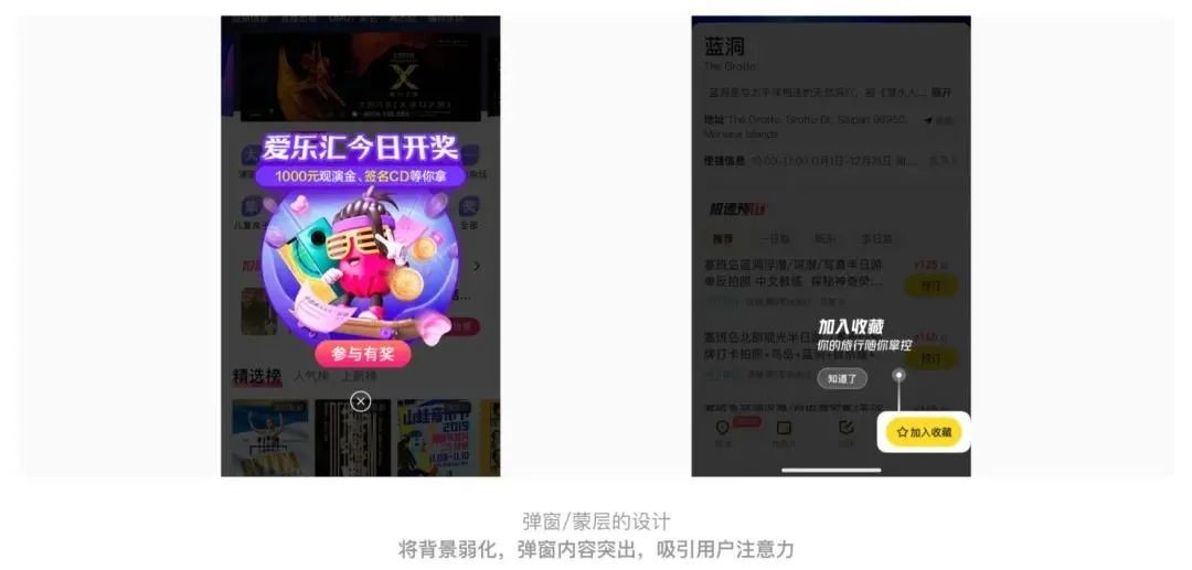 此原则可以帮助设计师在设计界面的过程中抓住用户注意力,并且让用户优先看到我们想让他们看到的事物。比如重要信息的弹窗提示以及弱化背景从而突出内容等界面中都有运用到此原则。