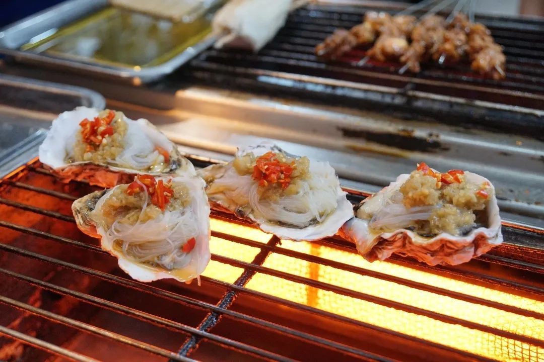 走进店里的时候,已经有好几桌客人入座,烧烤炉子上翻滚着油气,鲜虾、扇贝、牛肉、金针菇...各种食材散发的香气一个劲儿地往鼻子里钻。