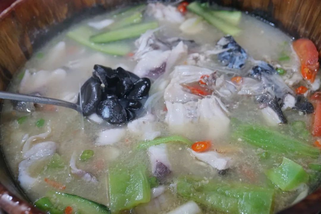 将烧烫的石头铺在木桶最底层,倒入现点现杀的新鲜鱼肉,再浇上混入各种食材的汤底,盖上盖子焖煮几分钟,一锅鲜嫩的鱼汤就好啦。