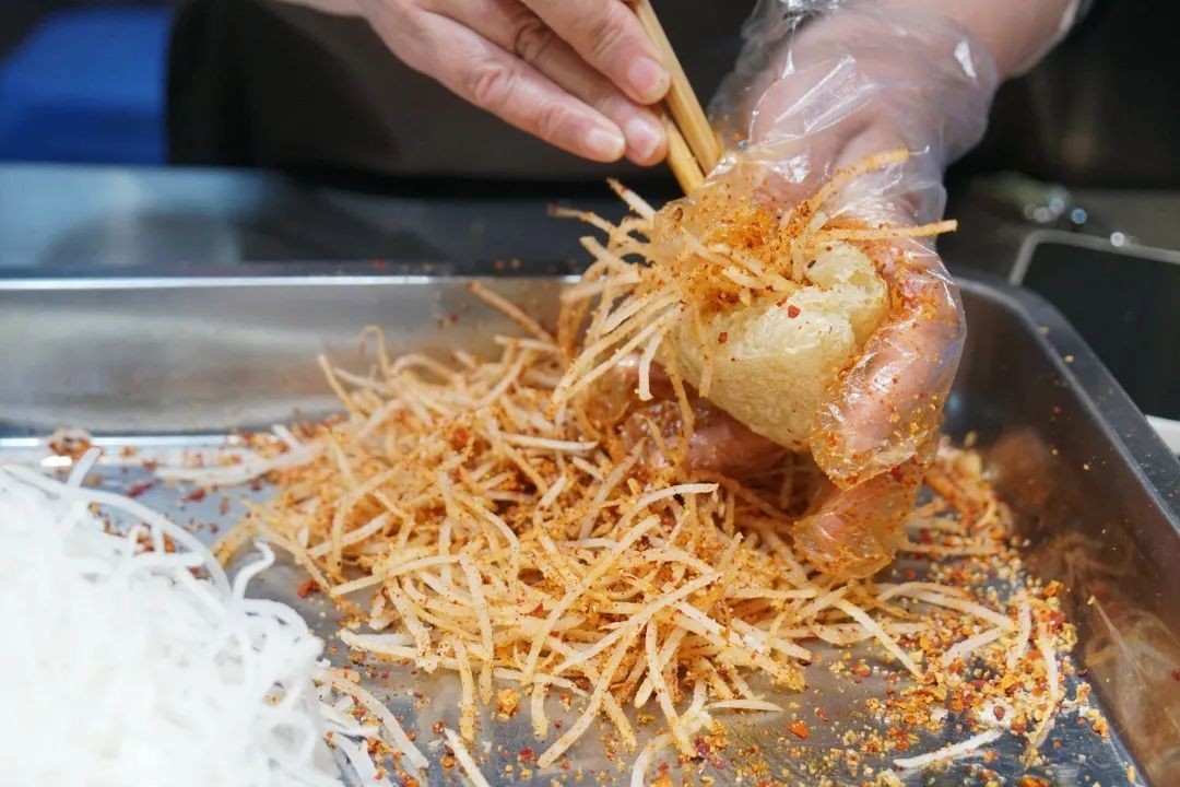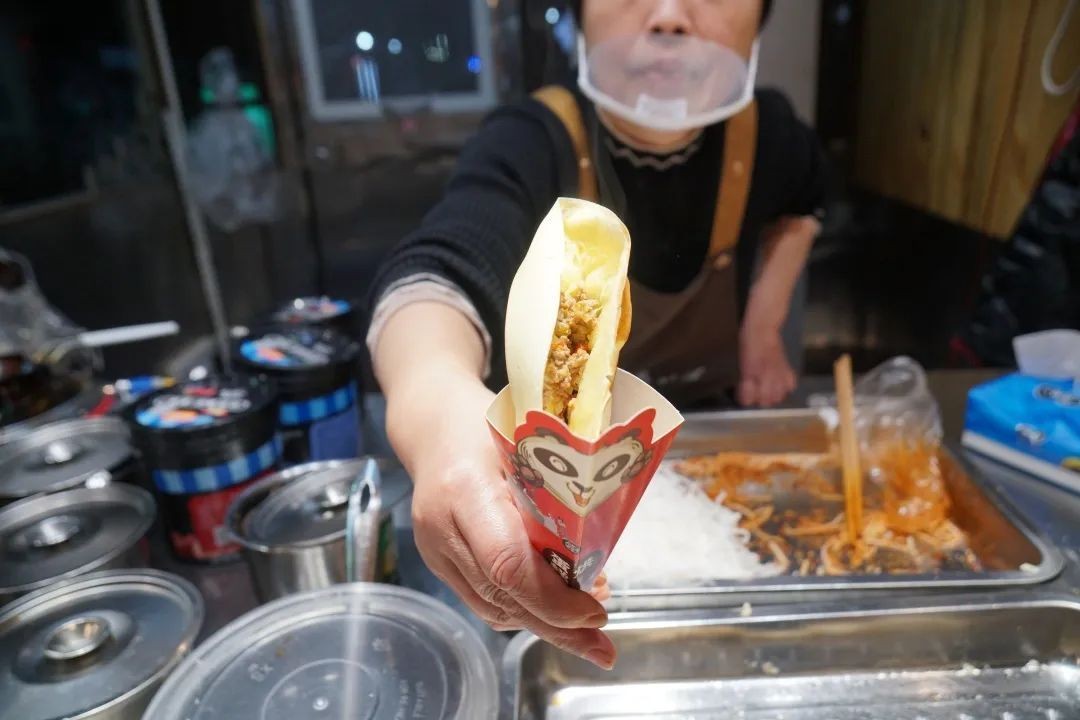 买了一份10元3个的西坝豆腐干和一块经典牛肉蛋烘糕,价格不算贵。豆腐干块大、脆而不硬,夹着拌了辣椒面的萝卜丝,再浇上醋汁便是酸辣爽口;蛋烘糕则用土鸡蛋作为原料,更加香甜。