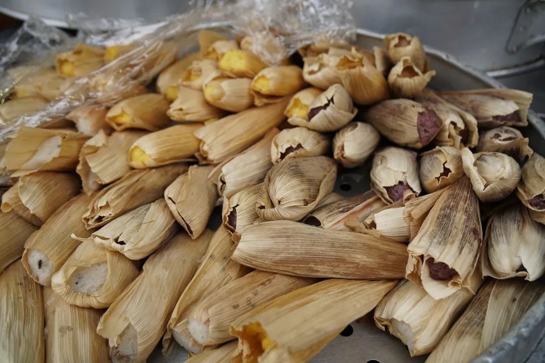 叶儿粑2.5元/斤,有芽菜、紫薯香菇、豆沙核桃、芝麻花生等多种口味;冻粑8-10元/斤,价格因玉米、黑米、红糖、白糖等口味的不同有着微小的变化,实惠又好吃。