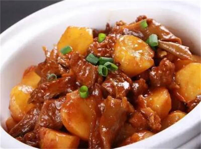 分钟左右,把土豆去皮,切成滚刀块儿,牛肉差不多炖烂之后把土豆块放进去,加盐调味儿炖到土豆软烂,出锅的时候放点小葱花。