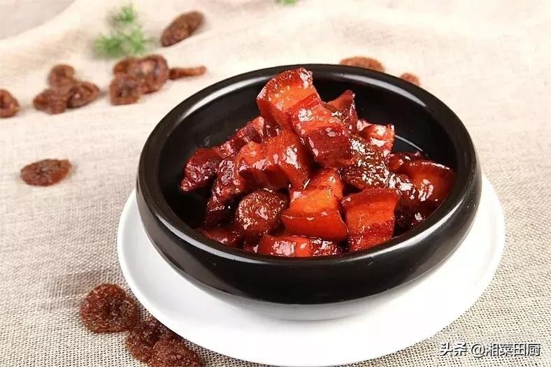 2、净锅上火放油,先下姜片、葱节、干辣椒节和猪五花肉块,爆炒出油后烹料酒,掺入煮肉的原汤,另外加放盐、红烧酱油、蚝油、海鲜酱、冰糖色、盐、香料和刺梨干,待慢火煨至熟透时,放鸡精、味精并推匀,见其收汁后,再装砂煲里上桌即可。