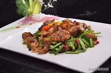 鳄鱼尾200克,韭菜花100克,彩椒件、干辣椒节、豆豉粒各少许。