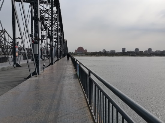 此桥如今成为爱国主义教育基地,游人不断,站在桥上能清楚看到对岸朝鲜新义州的建筑物。