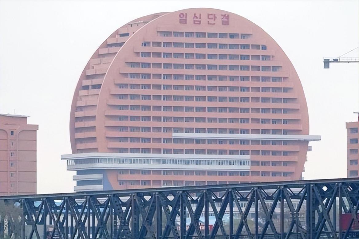 朝鲜新义州新建的地标建筑太阳楼。圆圆的形状真的很像太阳,高23层,是新义州第一高楼,丹东跟新义州只隔一条鸭绿江,在丹东就能看到新义州这栋圆形建筑。