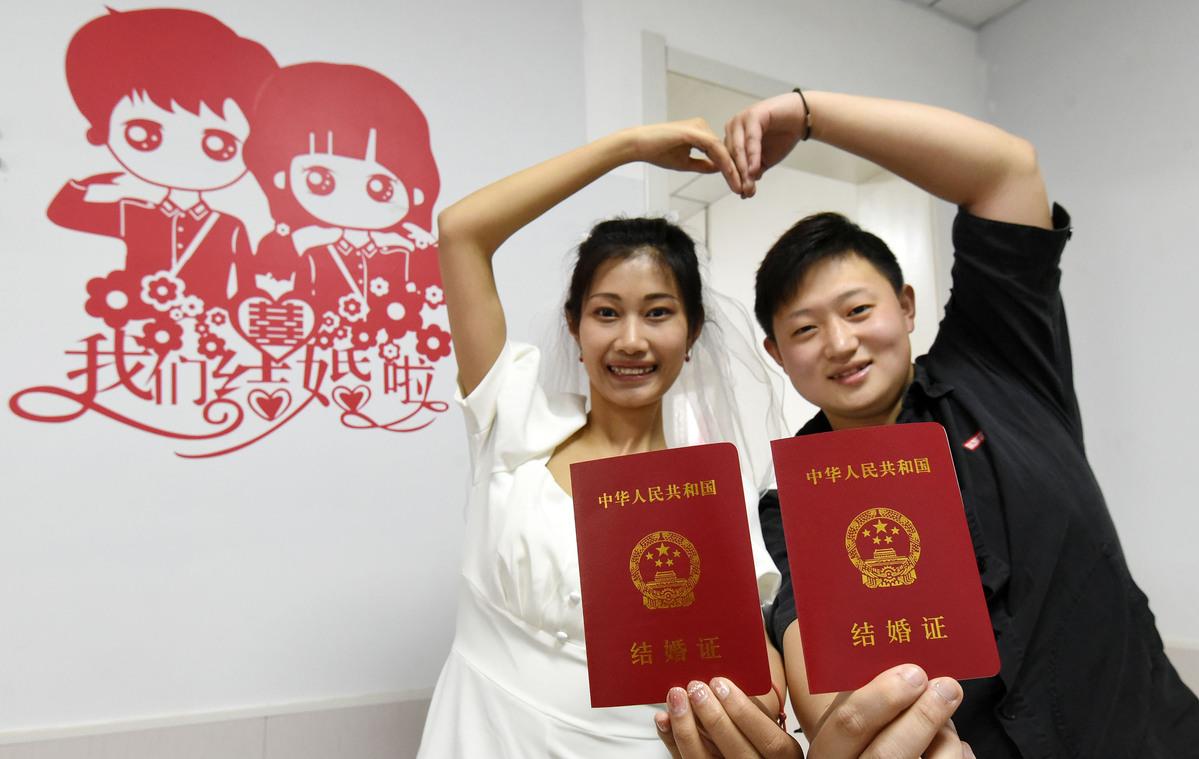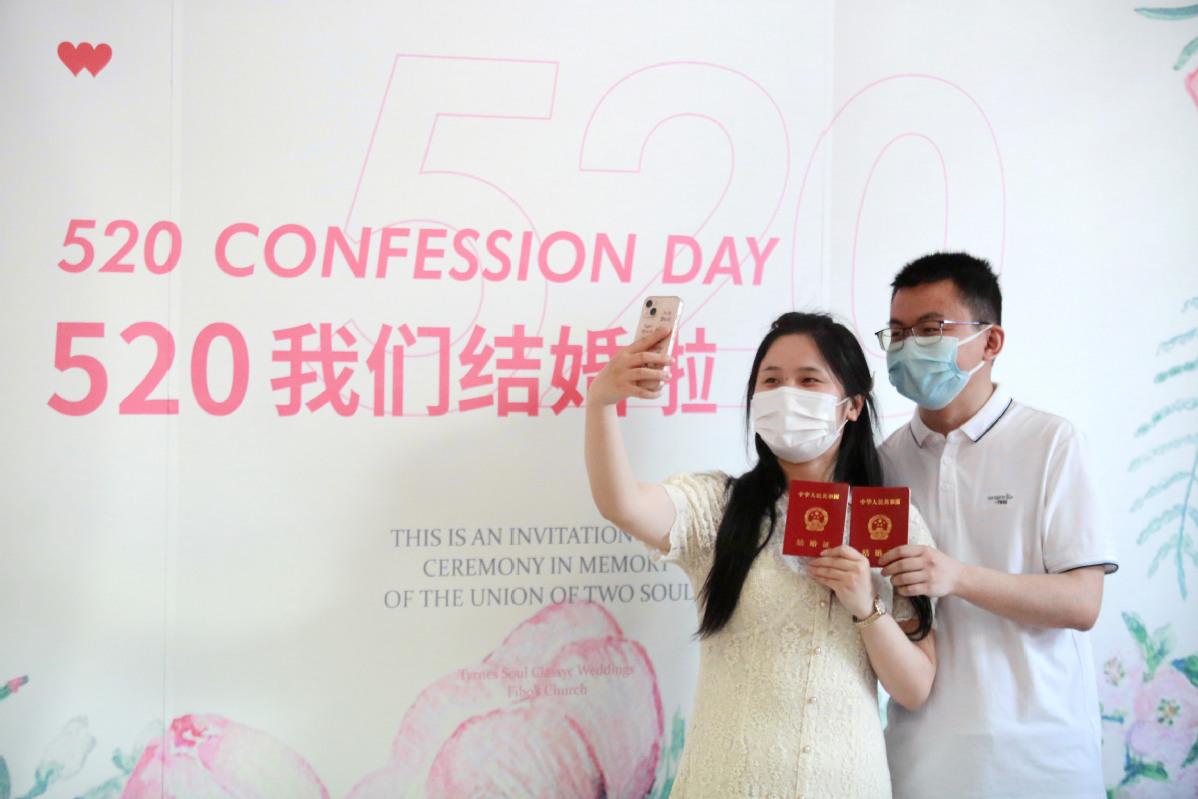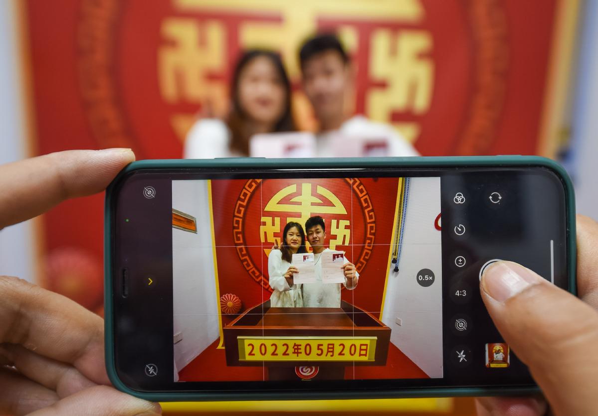 5月20日,河北省邯郸市复兴区民政局婚姻登记处,一对新人领取结婚证后拍照留念。王洪超 摄