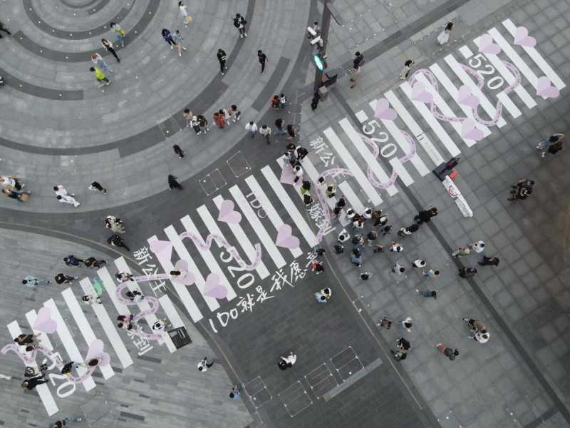 5月19日,浙江省杭州市湖滨步行街的爱心斑马线成为热门“打卡点”,市民纷纷拍照记录并分享这份浪漫。潘海松 摄
