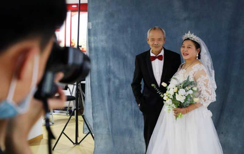 5月19日,安徽省合肥市蜀山区琥珀街道北苑村社区联合爱心摄影机构,为辖区15对老年夫妻重拍婚纱照。陈三虎 摄