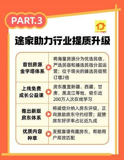 为了提升房东的服务能力,途家民宿2024年上线成长公益课,覆盖了新疆、西藏、甘肃、黑龙江等地近200万人次,助力他们进阶跃升;并组织多场线下交流会等房东社区活动,让房东们互帮互助交流服务经验。“我们希望能够为行业赋能,帮助民宿房东为客人提供更好的体验服务,同时也能为各地文旅住宿提供更多民宿解决方案。”胡阳指出。
