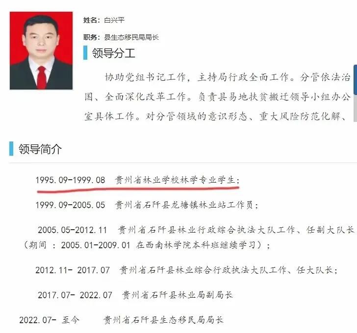 白兴平,1977年出生于贵州省石阡县,一个拥有仡佬族血统的青年才俊。自青年时代起,他便展现出了对林学领域的浓厚兴趣与卓越才华。1995年,他顺利考入贵州省林业学校林学专业,这一王牌专业为他日后的职业生涯奠定了坚实的基础。毕业后,他并未满足于已有的学历,而是继续深造,通过函授方式获得了大专文凭,并最终在西南林学院完成了本科学历教育。这一系列学术成就,无疑为白兴平的仕途铺平了道路。