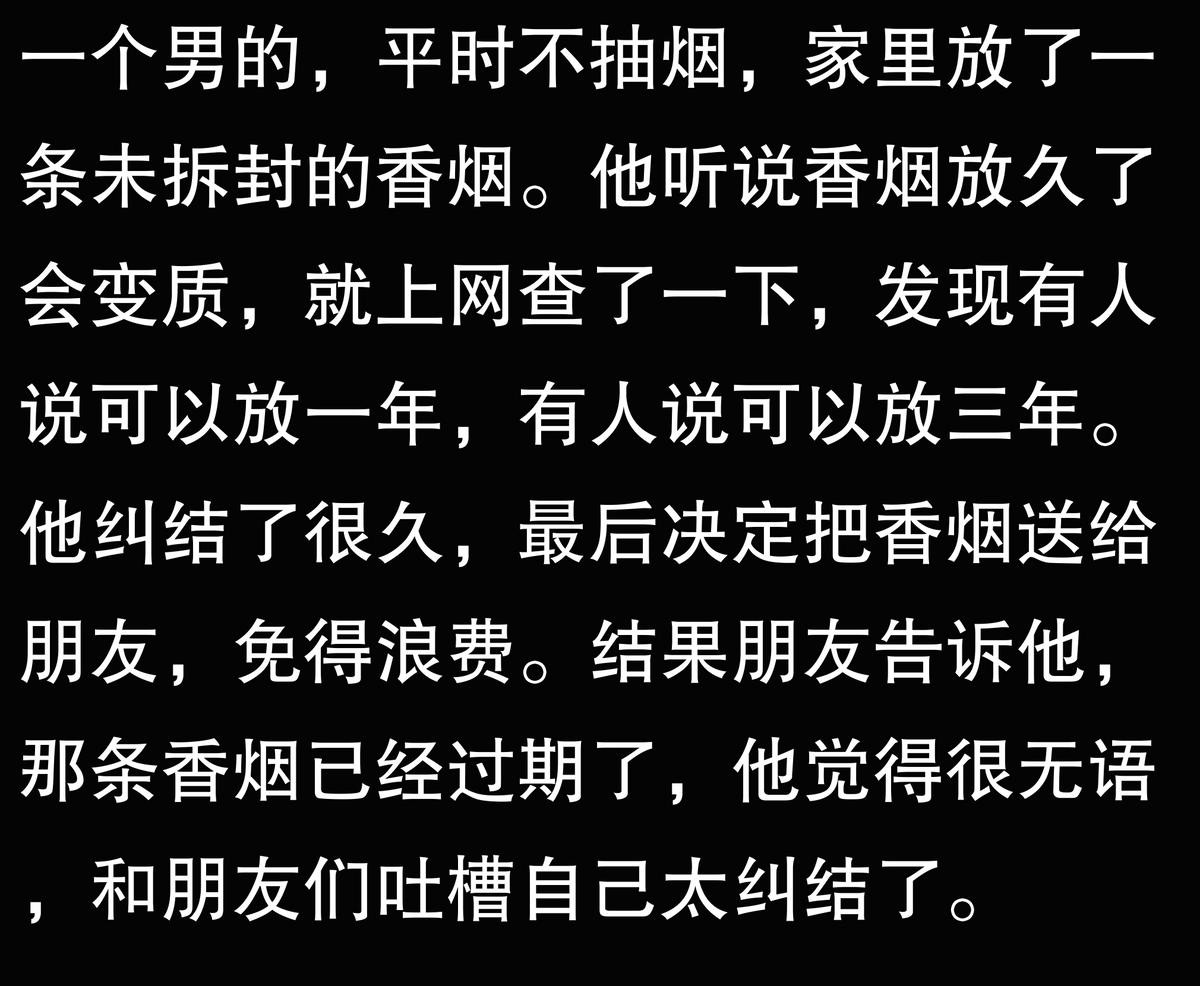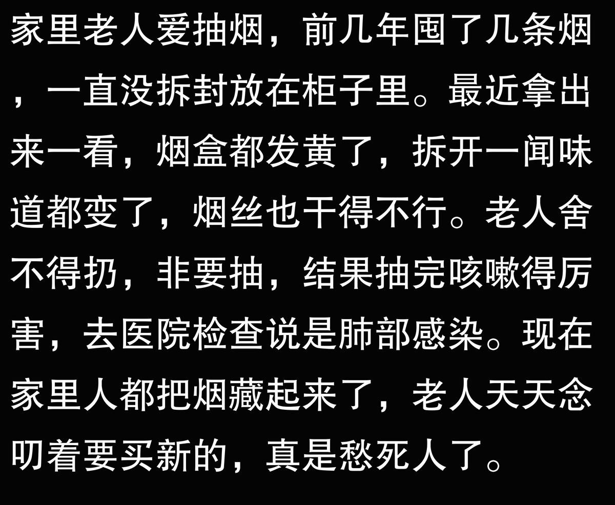 我爷爷80多岁了,烟瘾特别大,医生一直嘱咐他戒烟。结果前几天我在他床底下发现了一条未拆封的香烟,看包装都发黄了,估计藏了有两年多了。