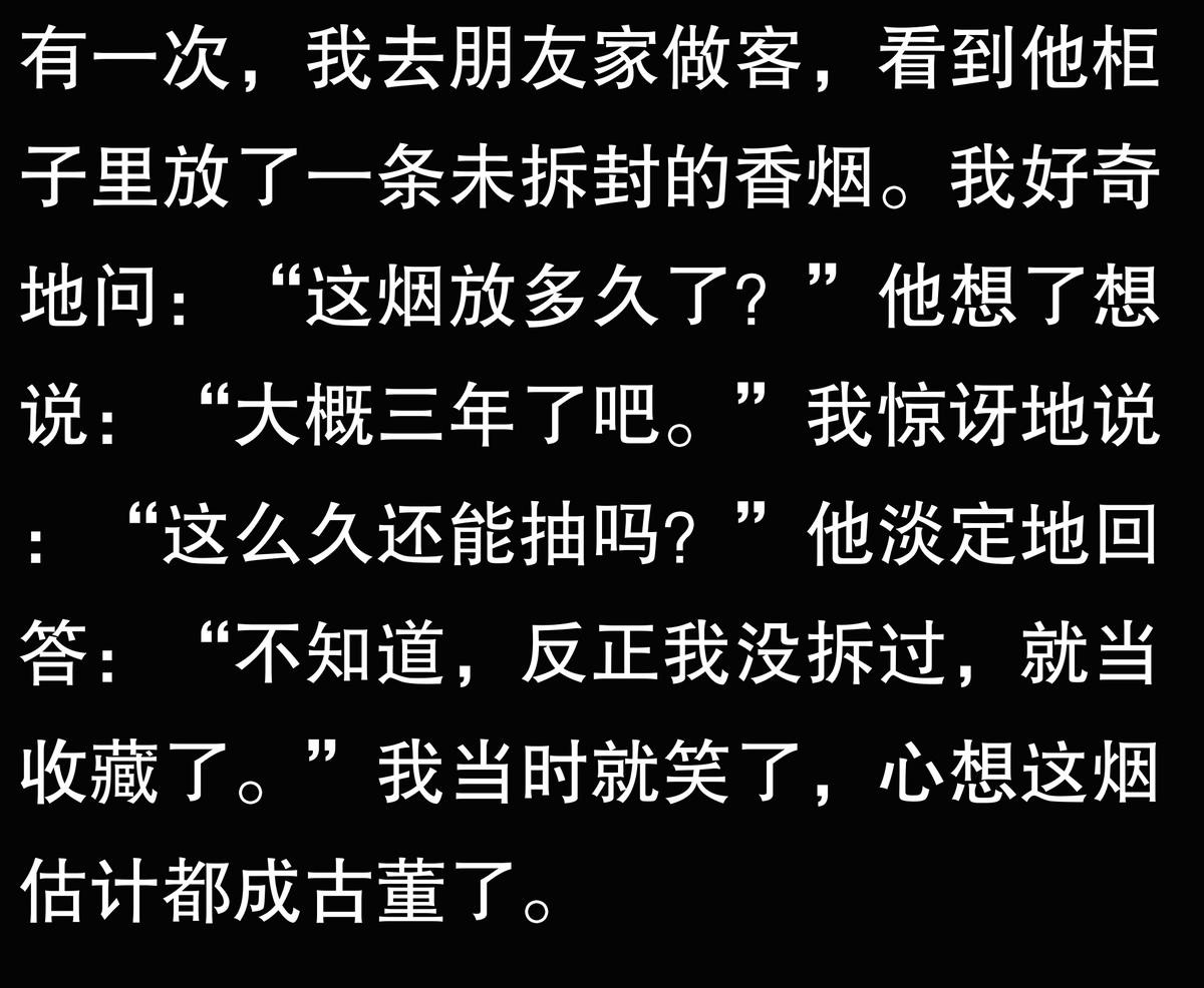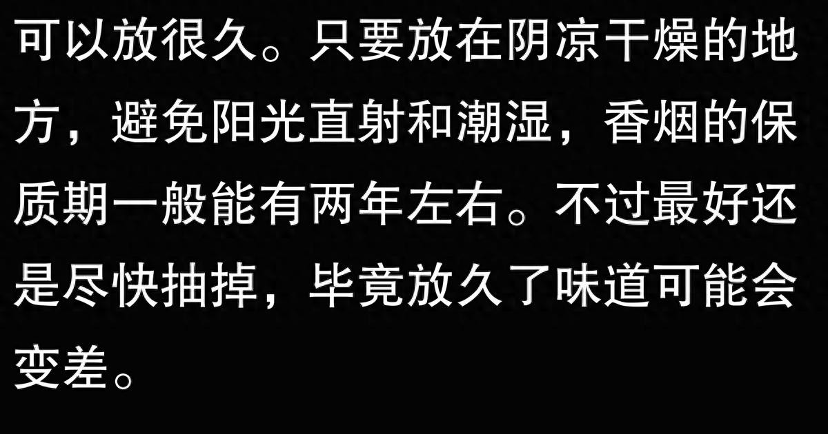 我家里有一条放了五年的烟,一直没拆封。前几天拿出来一看,烟盒都发黄了,打开一看里面的烟丝都干了,抽起来一股霉味。后来问了烟草店老板,说香烟最好在两年内抽完,放久了味道会变差。现在那条烟只能扔了,心疼死了。