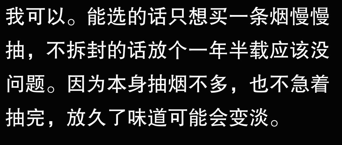 我可以。能选的话只想买一条烟慢慢抽,不拆封的话放个一年半载应该没问题。因为本身抽烟不多,也不急着抽完,放久了味道可能会变淡一点。