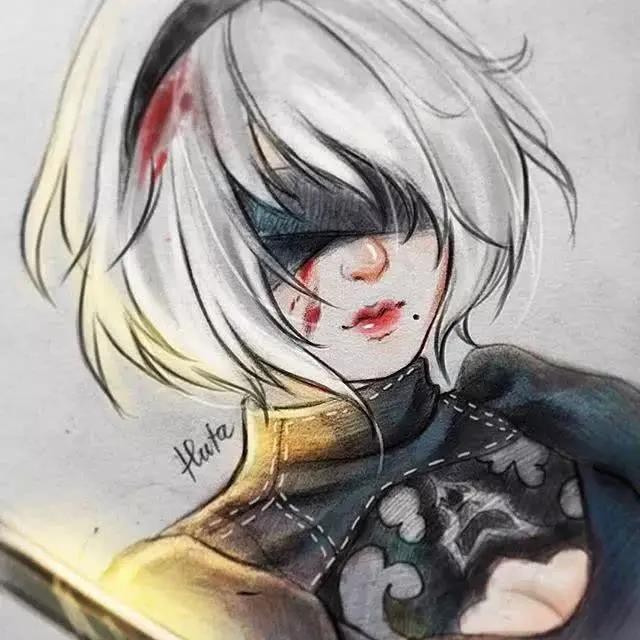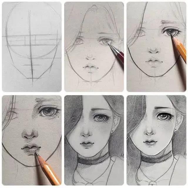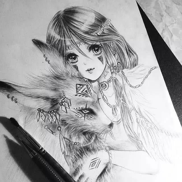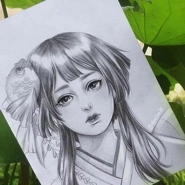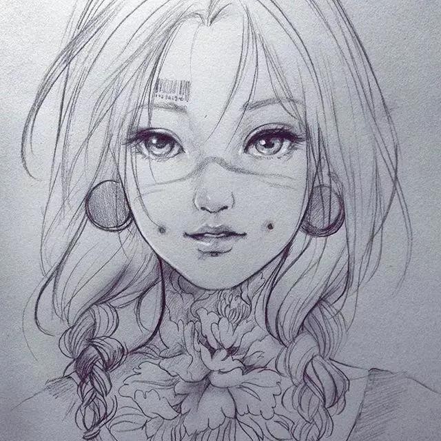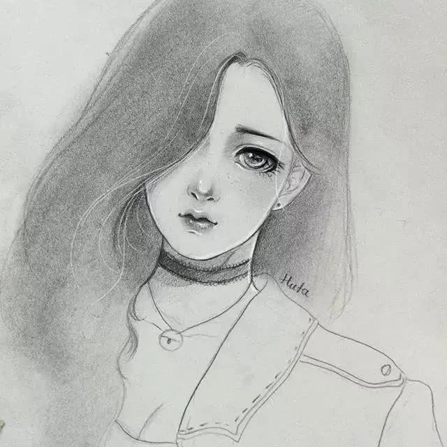 >>>【1】:用铅笔粗略打形,注意女孩的表情,眼神散出一种委屈,有些蹙眉;再用自动铅笔勾边,5B以上的比涂眼珠、眉毛、眼睫毛;鼻底和嘴唇涂抹上颜色;头发大面积涂抹,靠近皮肤的位置颜色稍重,脖子的阴影还有装饰品由深到浅排列调子;用白颜料在眼珠、眼角、鼻头、嘴唇上涂抹,发丝则用毛笔沾颜料勾勒。适当调整,完成(P1↓)