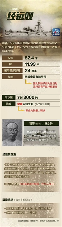 1894年9月17日爆发的中日甲午大海战,整整激战了5个多小时。北洋水师的“经远舰”在海战中中弹沉没,包括管带林永升在内的200多名将士阵亡,仅16人生还。这艘“经远舰”由德国伏尔铿船厂建造,全长82.4米,宽11.99米,装甲最厚的部分达到了24厘米。