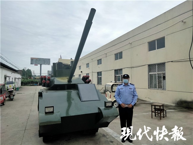 民警立即前往工厂调查,刚进院内,就看到一辆刚涂着迷彩色的霸气十足的“坦克”,该“坦克”上安装一门长长的“主炮”,边上还有十多个“榴弹发射器”,两个犀利的前大灯,有履带有齿轮,后面还挂着一个“油箱”,有模有样。