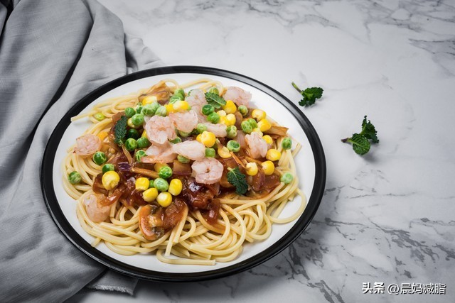 晚餐:青豆虾仁意面,其中意面70g,虾仁70g,青豆30g,水果人参果一个。