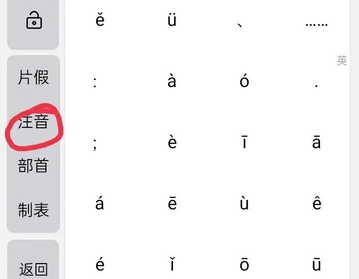 有人会说“符”的里面是一些标点符号呀?哪有音调?别着急,看左边竖着一排的小方格,显示“最近、中文、英文、表情、返回"。继续往上划,划、再划,直到划出来了“注音”。