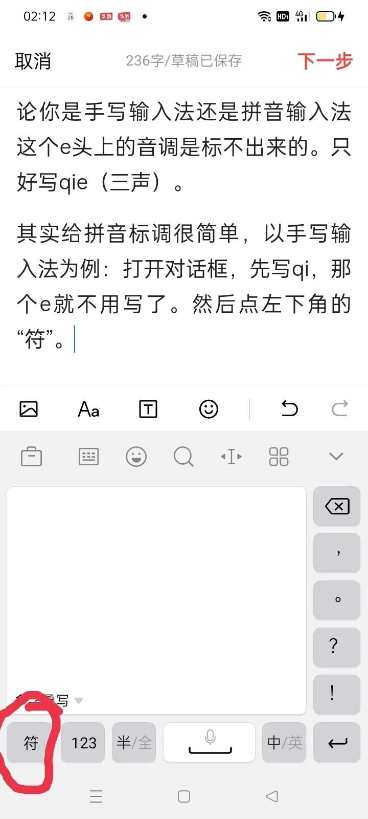其实给拼音标调很简单,以手写输入法为例:打开对话框,先写qi,那个e就不用写了。然后点左下角的“符”。