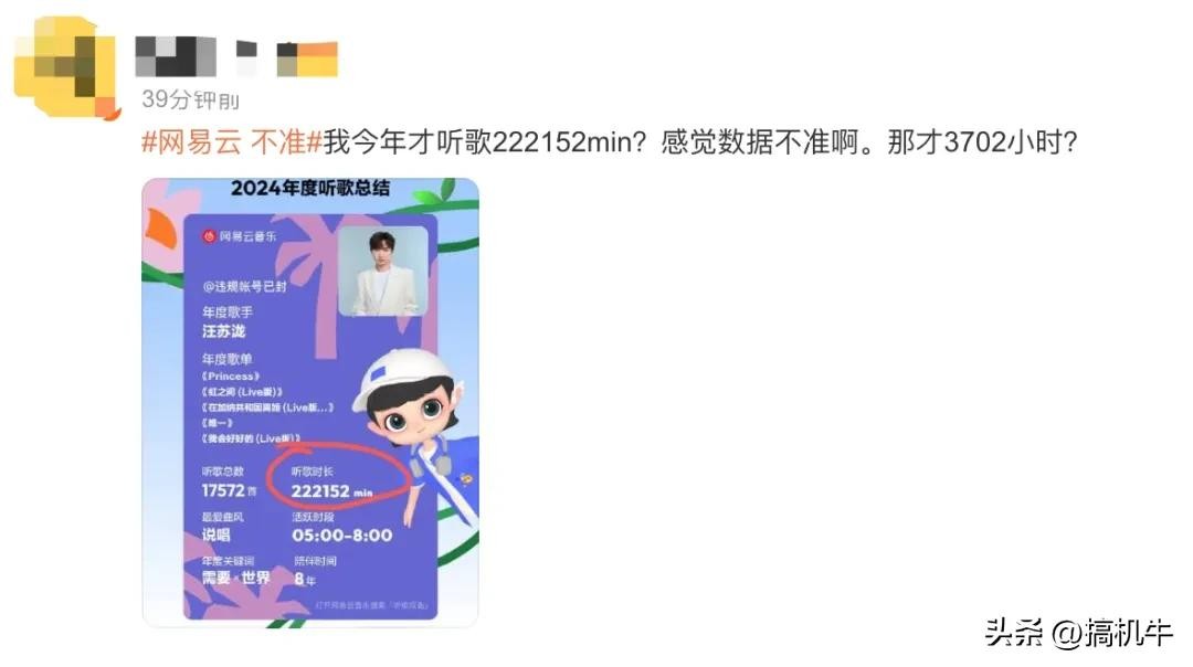 在微博上有很多网友反馈,网易云音乐的年度报告不准,比如出现没有听过的歌手名字,听歌时长不准,喜欢的歌手信息不准等等。
