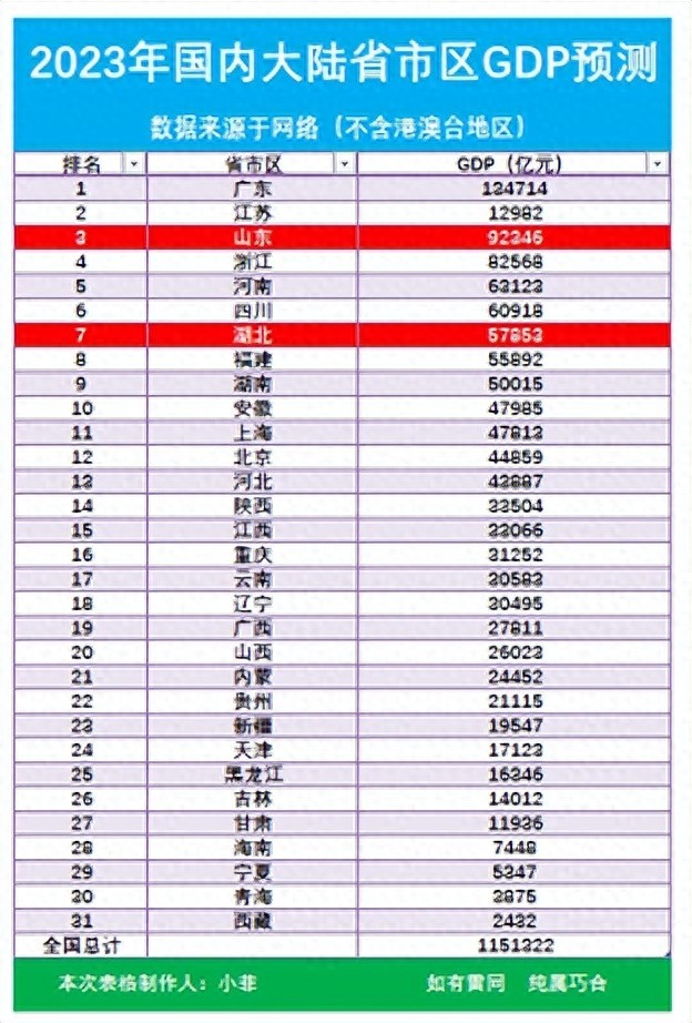 2023年国内大陆省市区GDP预测榜中,湖北省位于第7位,与去年名次保持不变。