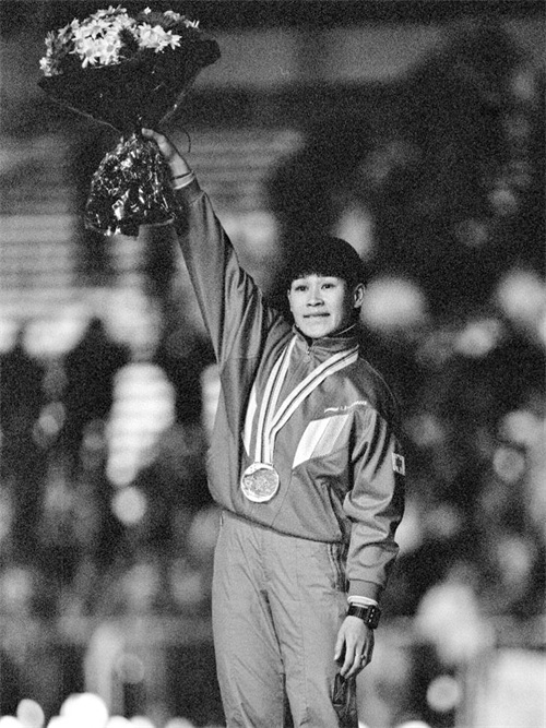 图为1992年2月10日,获得银牌的中国选手叶乔波在冬奥会女子速滑500米比赛颁奖仪式上向观众致意。