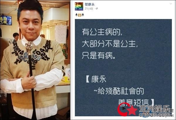 1月7日蔡康永在脸书上直言写道“有公主病的人,大部分都不是公主,‘只是有病!’”