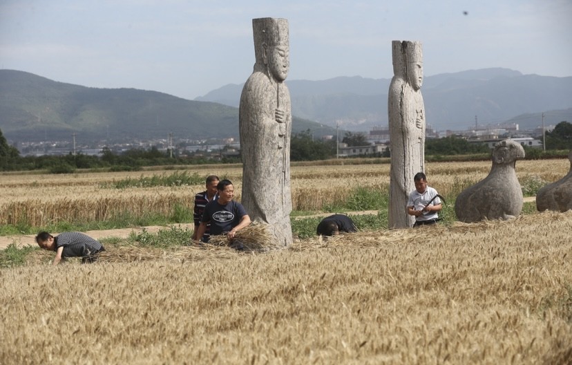 6月1日,工作人员在永熙后陵使用镰刀收割石像生周边小麦。