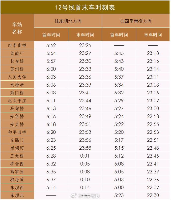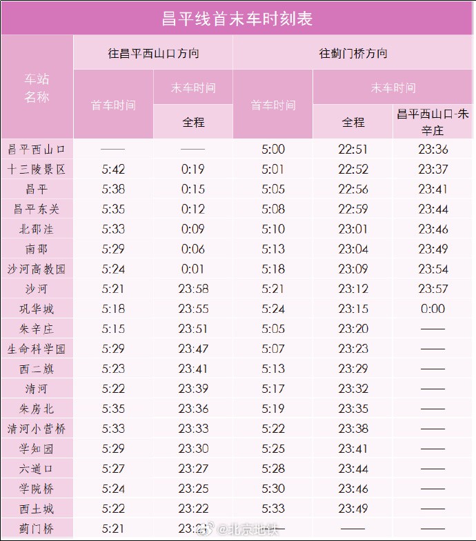 12月15日启用 北京3段新地铁各站首末车时刻表公布
