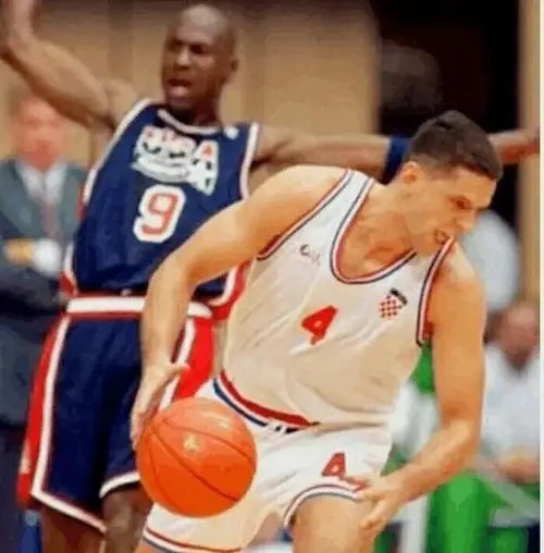 反观彼得洛维奇,南斯拉夫解体之后,代表克罗地亚出战的他,领着半只南斯拉夫队,砥砺前行打进总决赛,实属不易。作为欧洲闯荡NBA的第一人,彼得洛维奇深知梦一实力不可撼动,但是自己作为欧洲第一人,岂能认怂,明知山有虎偏向虎山行。尤其是对位篮球之神乔丹,作为欧洲之王,彼得洛维奇绝不低头,他要向全世界证明他有能力和乔丹一争高下。实际上那场比赛,克罗地亚一度26-24领先了两分,令梦一虎躯一震。如梦方醒,大杀器巴克利力挽狂澜,再没给克罗地亚机会,梦一117比85轻胜克罗地亚。但是27岁的彼得洛维奇在与乔丹的直接对话中砍下全场最高的24分5助攻和4抢断,数据上比乔丹22分还要亮眼,赢得了乔丹的尊重。这是在乔丹职业生涯中,唯一一次有人在决赛中对位硬刚,数据全面超过自己,那年乔丹28岁,正值最巅峰。彼得洛维奇虽败犹荣,能被大鸟和乔丹两位超级逼王认可,极为罕见。