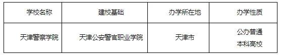 根据《中华人民共和国高等教育法》、《普通本科学校设置暂行规定》等法律法规和规定,按照教育部有关工作部署和我市高校设置工作相关要求,经我市高校设置委员会专家考察和评议,现对拟向教育部申报的以天津公安警官职业学院为基础设立天津警察学院事项进行公示。