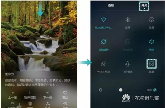 让手机屏幕停留在您想要截取的画面,从状态栏向下滑动,打开通知面板,在【开关】页签下,点击【截屏】开关截取屏幕。(PS:包含通知面板的画面,无法通过快捷开关截屏。)