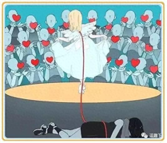 图一.不要被表象所迷惑,图片中的很多人都被眼前的所谓的天使所迷惑,他们的目光都热衷的追随着她的身影,但是殊不知在它的身影背后是一个邪恶的人。但是又有谁会真正的注意到。