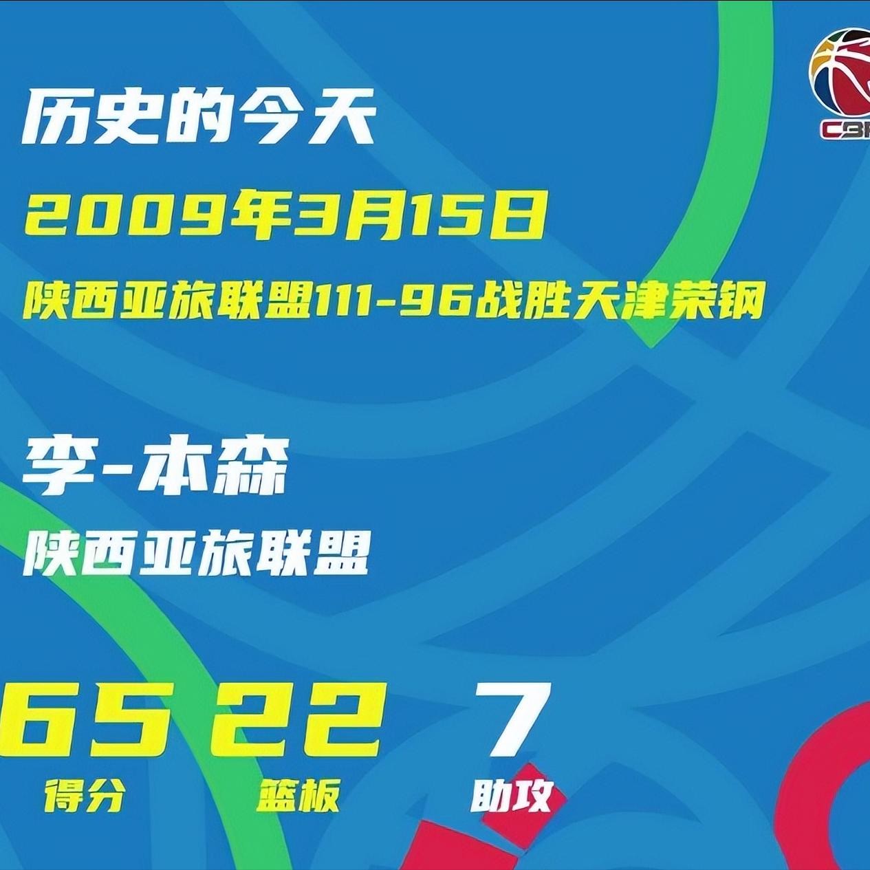 在CBA联赛的光辉历史中,3月15日这一天铭刻着一个特殊的纪录,当时外籍球员李-本森展现出了令人瞩目的个人能力,创造了一个至今无人能及的壮举。在2009年的这一天,他以一己之力带领陕西亚旅联盟以111-96的比分战胜天津荣钢,个人狂砍65分22篮板7助攻的数据,成就了CBA联赛史上的第一个也是唯一的“60+20+5”的纪录。