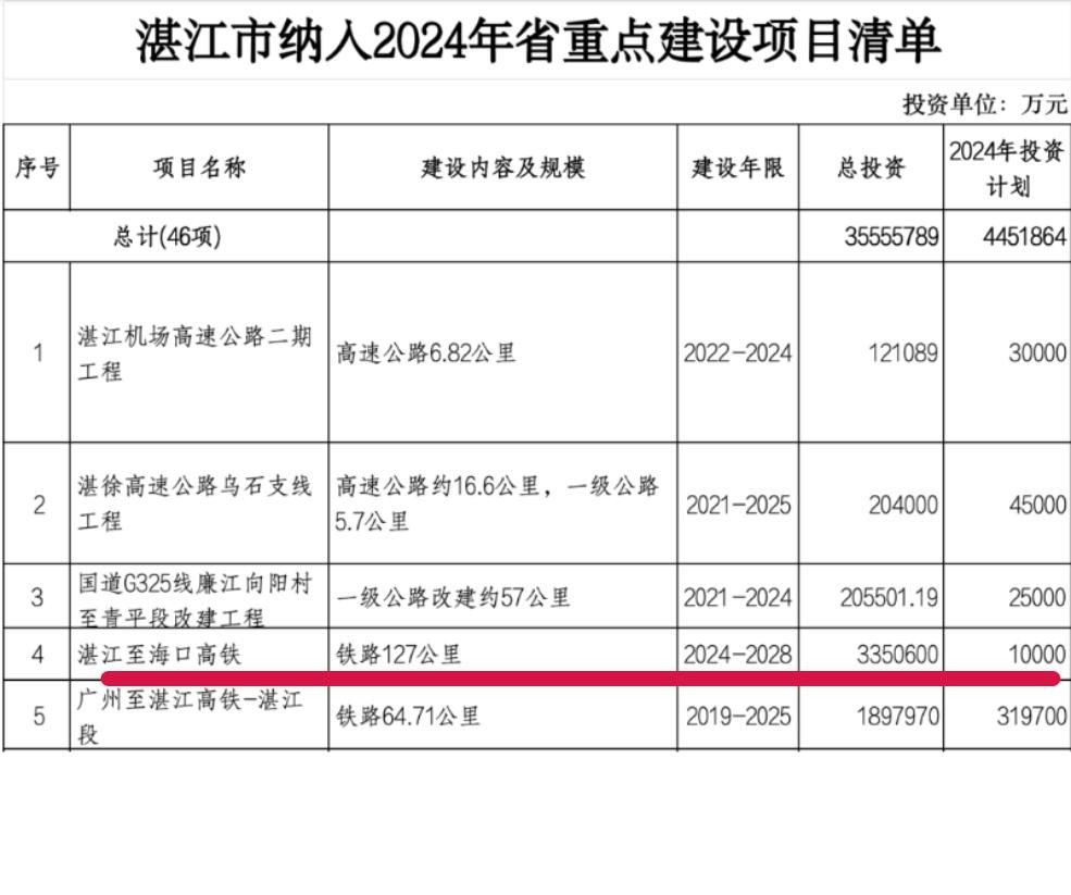 近日,湛江市发展和改革局发布《湛江市2024年重点建设项目计划表》,根据公布的内容来看,2024年重点建设项目共530项,计划总投资约8212.31亿元,其中2024年计划投资额970亿元,占总投资额约11.8%;湛江市2024年重点建设前期预备项目合计201项,估算总投资253.08亿元。其中令人关注的项目有:湛江至海口高速铁路项目(新建)。