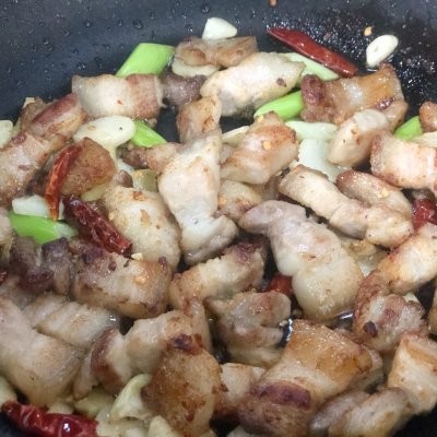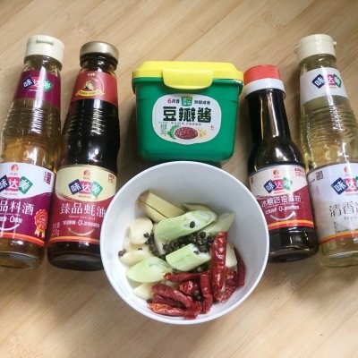 五花肉 500克茄子 2个色拉油 15克大葱 1段生姜 2片麻椒 15粒大蒜 5瓣干辣椒 5个豆瓣酱 1勺老抽 15ml料酒 15ml蚝油 1勺米醋 10ml冰糖 4小块