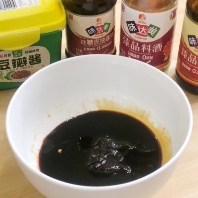 7、空碗中加入豆瓣酱、老抽、料酒、蚝油,搅拌均匀