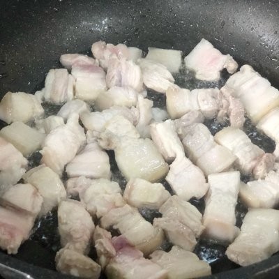 4、锅中倒适量食用油,五花肉下锅煎制金黄