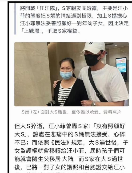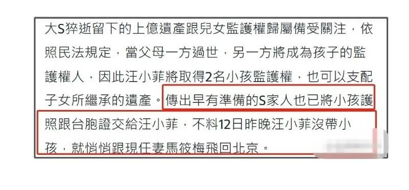 近日,大S的离世不仅让粉丝们心痛不已,更掀起了一场关于遗产、抚养权以及家庭情感的复杂纷争。