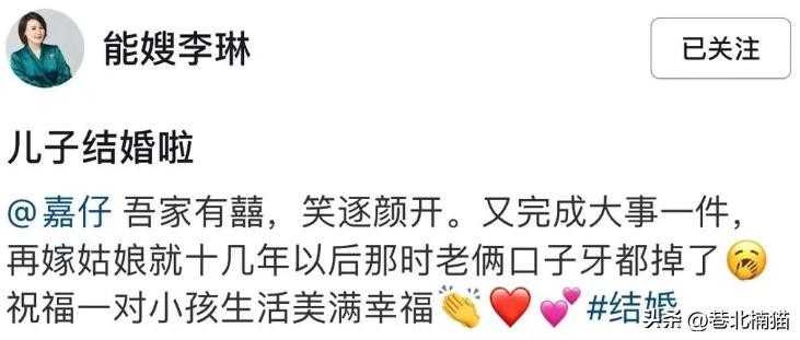 前两天,他的妻子在社交平台发文宣布自己的孩子结婚的消息。