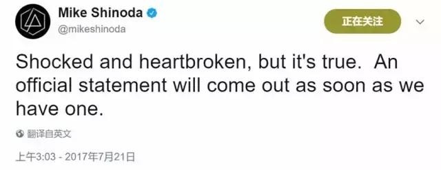 另一位主唱Mike Shinoda证实了Chester已经离世的消息,他发文说,“震惊与心碎,但这是真的。正式的官方声明将尽快公布”。