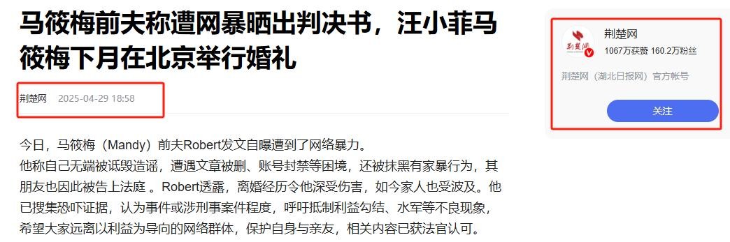 2.荆楚网:《马筱梅前夫称遭网暴晒出判决书,汪小菲马筱梅下月在北京举行婚礼》-2025-4-29