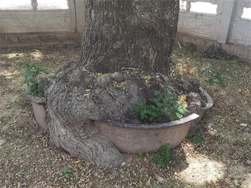 再往东有一棵三人合抱的大槐树,这颗大槐树是长在一口大铁锅内的,锅体埋于土中,称为"铁锅槐"。这是白云寺的一大奇观。相传,一只凤凰叼黑槐籽坠落锅内,奇迹般地生出一棵幼苗。佛定大师惊喜道:"凤凰送子,铁锅育秀,乃宝刹之吉兆也!"经过精心护理,代代培育,成为一大奇观。