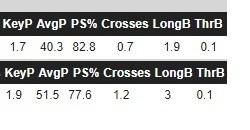 而对比本赛季和在药厂最后一个赛季的进攻数据,不难发现,其实两者之间的差距也微乎其微。场均射门数差了0.1几乎可以忽略不计;场均keypass差了0.2,这个我放在后面说,后面有专门讲传球的部分;场均过人多了0.2,场均被犯规却少了0.5,说明尽管盘带的次数增加了,但对对手的威胁其实降低了;场均越位少了0.2说明位置更靠后了;场均被抢断和失误各少了0.1,还是在向好的方向发展。