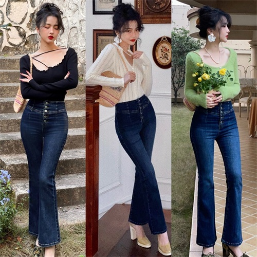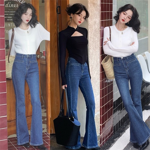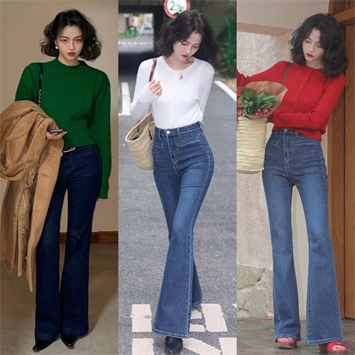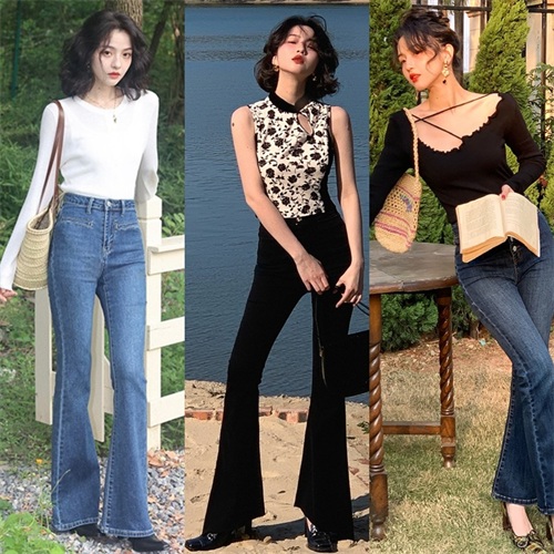 建议大家可以尝试下图中牛仔材质的九分喇叭裤,自带廓形感的牛仔面料搭配上九分长度的裤管,遮肉显瘦的同时还能轻松打造出干练飒爽的优雅气质,随便搭配一件衬衫就是绝对不会出错的秋日职场穿搭。