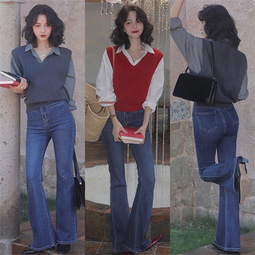 针织马甲的叠穿搭配演绎出满满的精致感,搭配喇叭裤更显时髦有型,彰显不俗的穿搭品味。