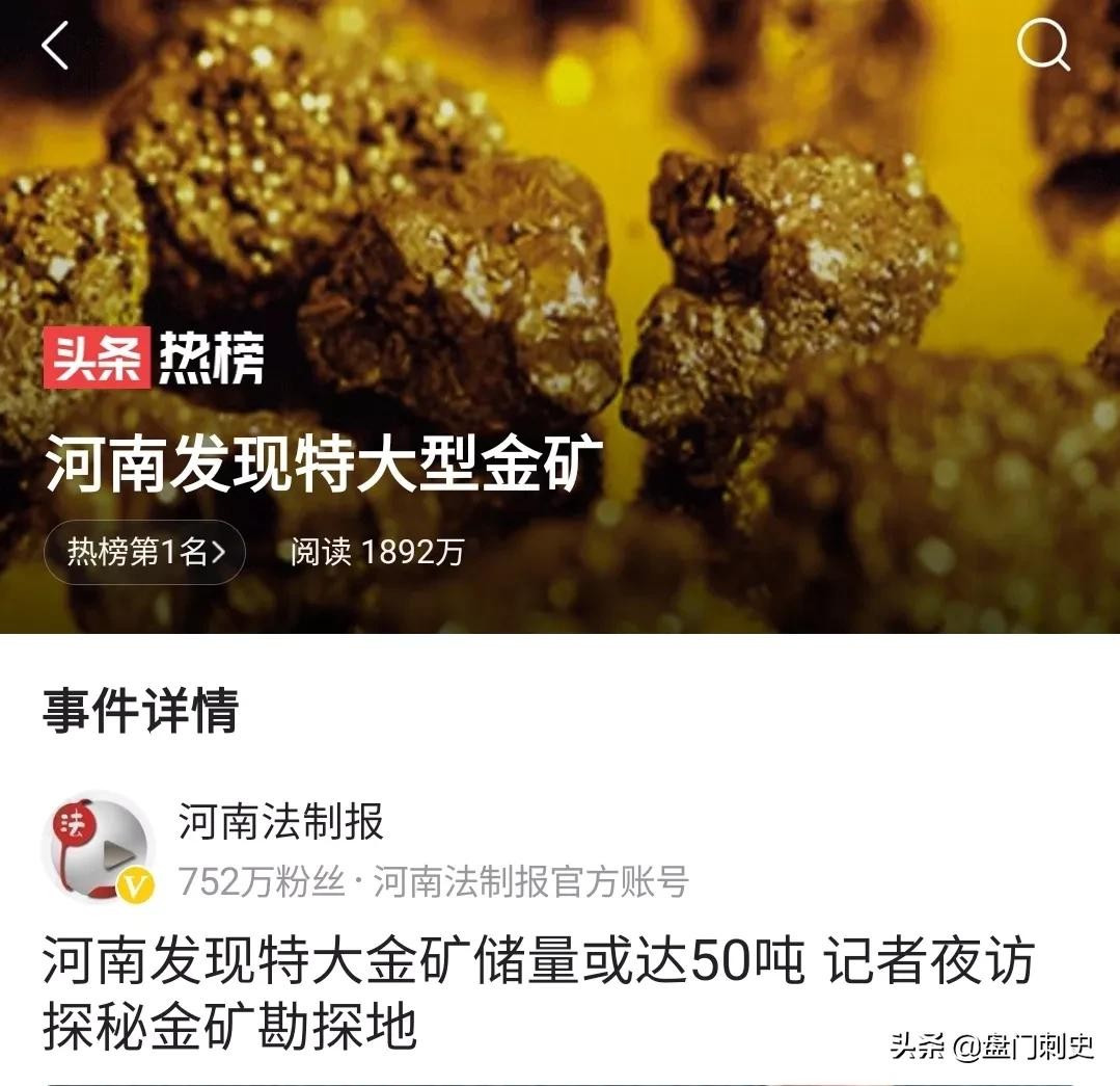 这两天打开头条,不管是推荐还是热搜,“河南发现特大型金矿”频频跳出纸面跃入眼帘。一度霸持头条热搜榜前三甲位置,热度持久不衰,今天甚至开始了直播报道! 这让…,汪汪队,不,让汪F大大见了还不急眼啊。