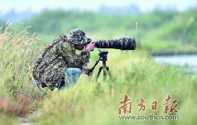 一身迷彩服,头戴一顶用树叶做成的帽子,架起长达1米的“大炮”,一动不动地趴在泥泞里,屏住呼吸等待最佳的快门时机……在汕头户外场地,偶尔能见到这位装备齐全的摄影爱好者,他就是人称海关“鸟叔”的陈东文。