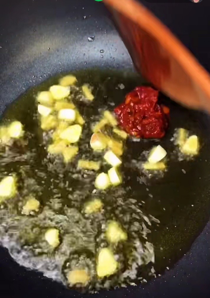 步骤2:起锅烧油,油热后放干辣椒、葱、姜、蒜、沫、豆瓣酱、炒出料香味,加水放入猪血豆腐开炖。